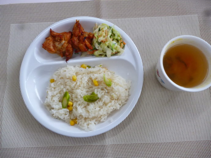 本日の給食は、「アスパラごはん」、「タンドリー風味チキン」、「ドレッシングサラダ」と「玉葱とわかめのスープ」