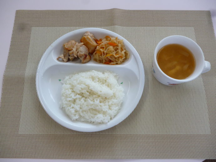 今日の給食は「鶏の桑焼き」「切干大根の煮付け」「味噌汁」です。