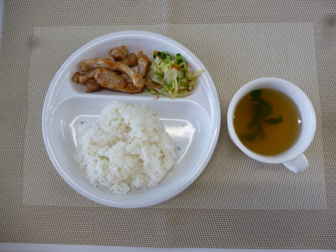 今日の給食は「豚肉のかりん揚げ」「キャベツのおかか和え」「湯葉とみつばのすまし汁」です。