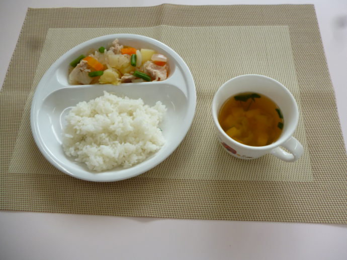 今日の献立は、「豚肉と野菜の旨煮」と「味噌汁」 おやつは、「牛乳」、「りんごゼリー」と「ぽたぽた焼」です。