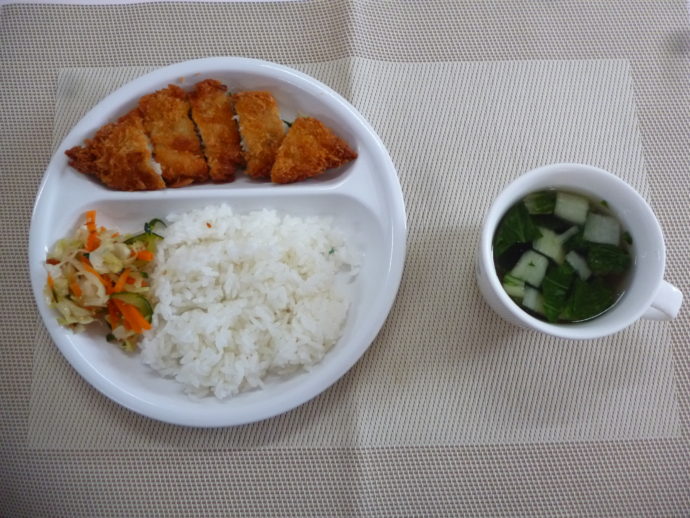 本日の給食は、「白身魚のフライ」、「和風サラダ」と「キノコスープ」 おやつは、「牛乳」、「バナナ」と「えびちび」です。