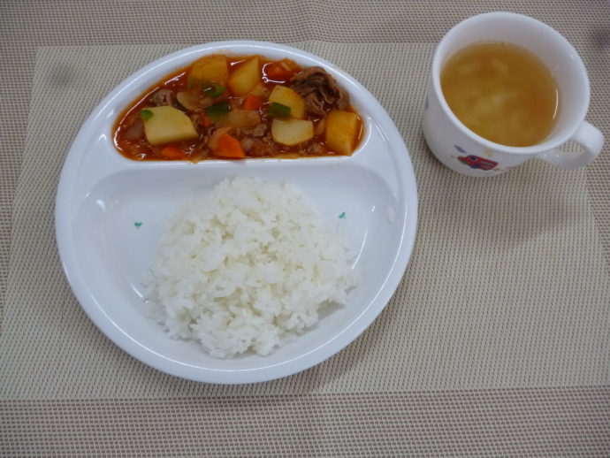 本日の給食は、「牛肉と野菜のケチャップ煮」と「高野豆腐のスープ」 おやつは、「牛乳」、「とうもろこし」と「星たべよう」です。