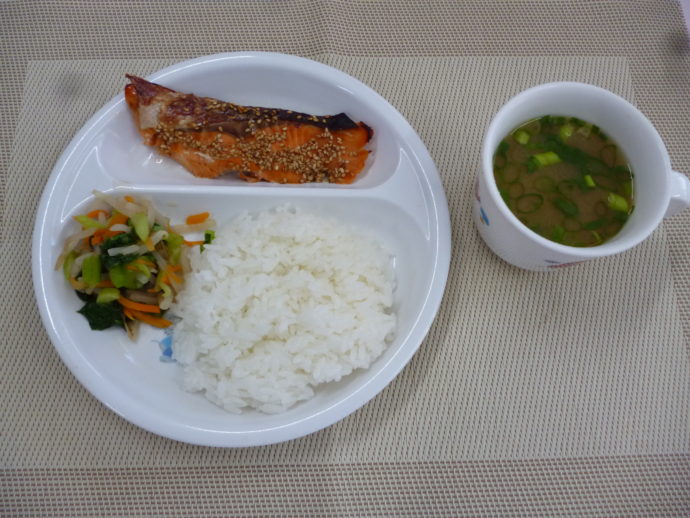 今日の給食は、「鮭の南部焼き」、「チンゲン菜のお浸し」と「南瓜のみそ汁」