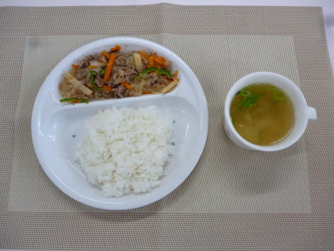 今日の給食は「チャプチェ」「豆腐と玉ねぎのスープ」です。 おやつは「豆乳あべかわ」「ソフトせんべい」「牛乳」です。