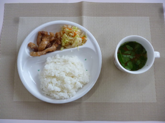 本日の給食は、「豚肉のかりん揚げ」、「キャベツのおかか和え」と「湯葉とみつばのすまし汁」