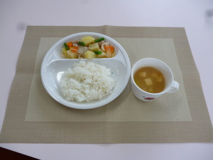 今日の給食は、「豚肉と野菜の旨煮」と「味噌汁」 おやつは、「牛乳」、「りんごゼリー」と「ぽたぽた焼」です。