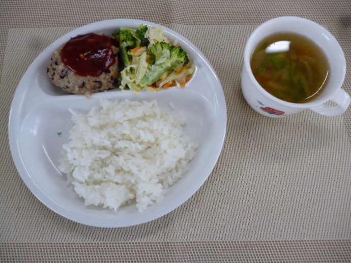今日の給食は、「豆腐ハンバーグ」、「蒸し野菜のサラダ」と「きのこのスープ」