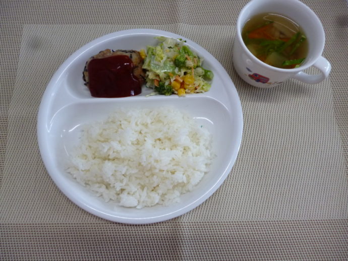 本日の給食は、「豆腐ハンバーグ」、「蒸し野菜のサラダ」と「キノコスープ」