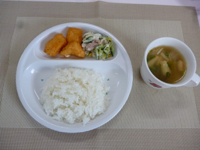 本日の給食は、「カレイの竜田揚げ」、「大根とツナの和え物」と「白菜の味噌汁」