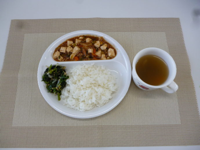 今日の給食は「麻婆豆腐」「ほうれん草のナムル」「中華スープ」です。