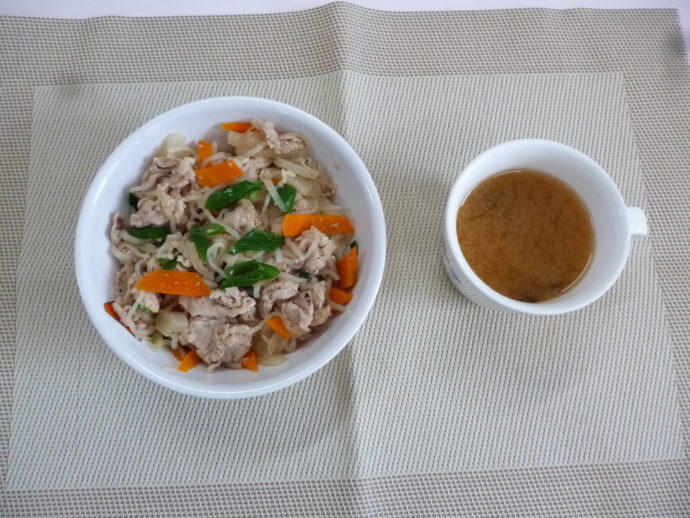 本日の給食は、「豚丼」と「大根のみそ汁」 おやつは、「牛乳」、「プチゼリー」と「おにぎりせんべい」です。