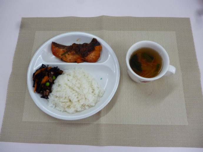 本日の給食は、「鮭のねぎみそ焼き」、「ひじきの煮物」と「小松菜のすまし汁」 「牛乳」、「オレンジ」と「雪の宿」です。