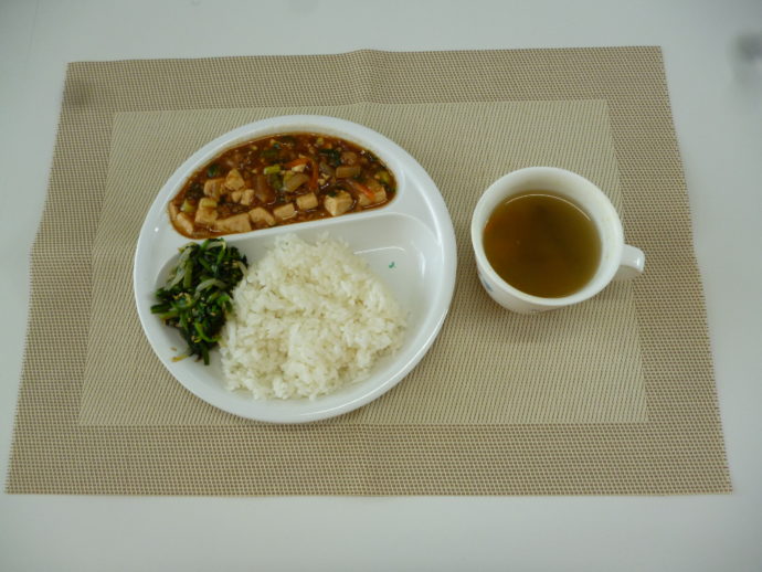 今日の給食は「麻婆豆腐」「ほうれん草のナムル」「中華スープ」です。