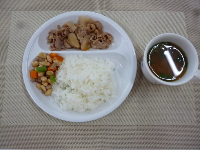 今日の給食は、「豚肉のしょうが焼き」、「五目煮豆」と「豆腐のみそ汁」 おやつは、「牛乳」、「モモ缶」と「アスパラガスビスケット」です。